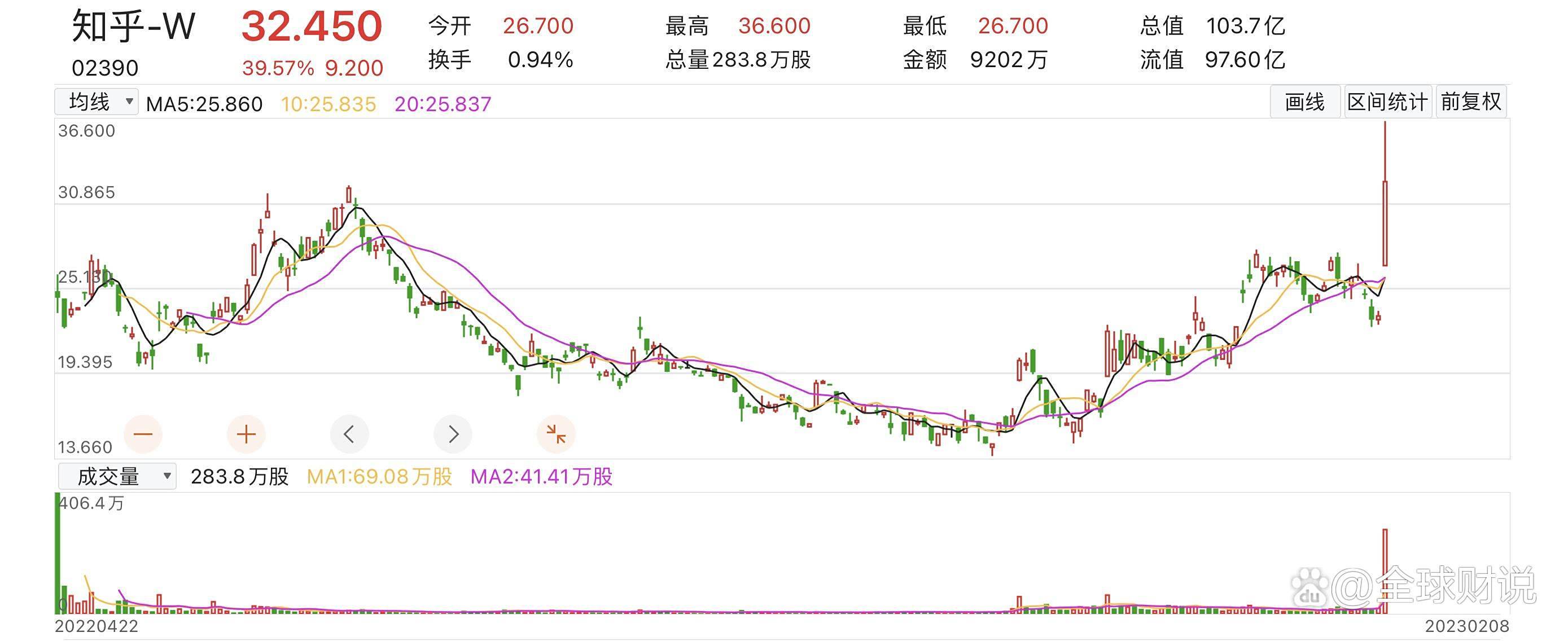 自美东时间2月7日美股知乎狂涨超30%后,2月8日港股知乎高开高走,午后股价曾一度涨超56%,股价达到36.6港元/股。截至收盘,港股知乎收涨39.57%,报收32.45港元/股,创下自2022年4月22日登陆港股后的最高股价,最新市值为103.7亿港元。